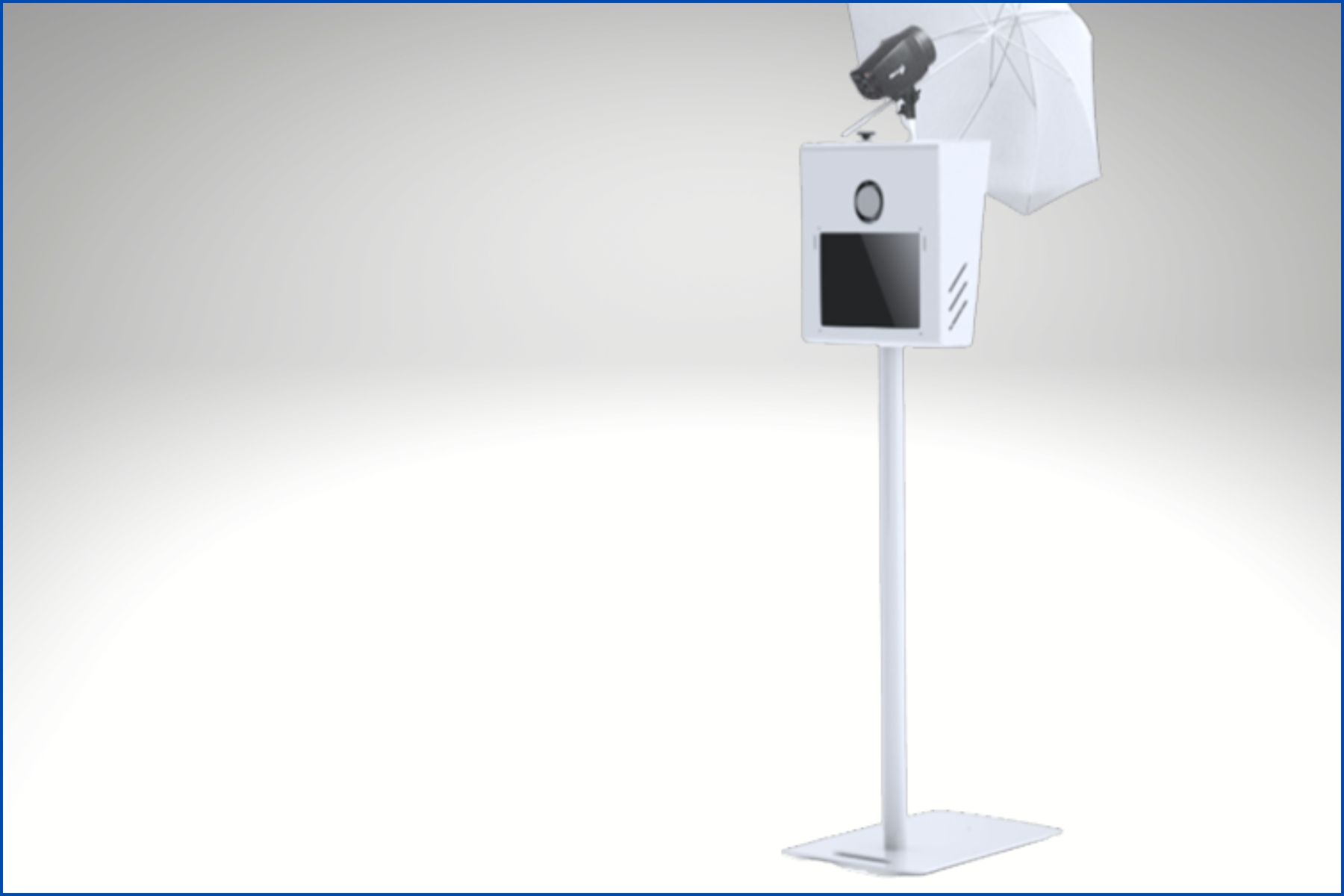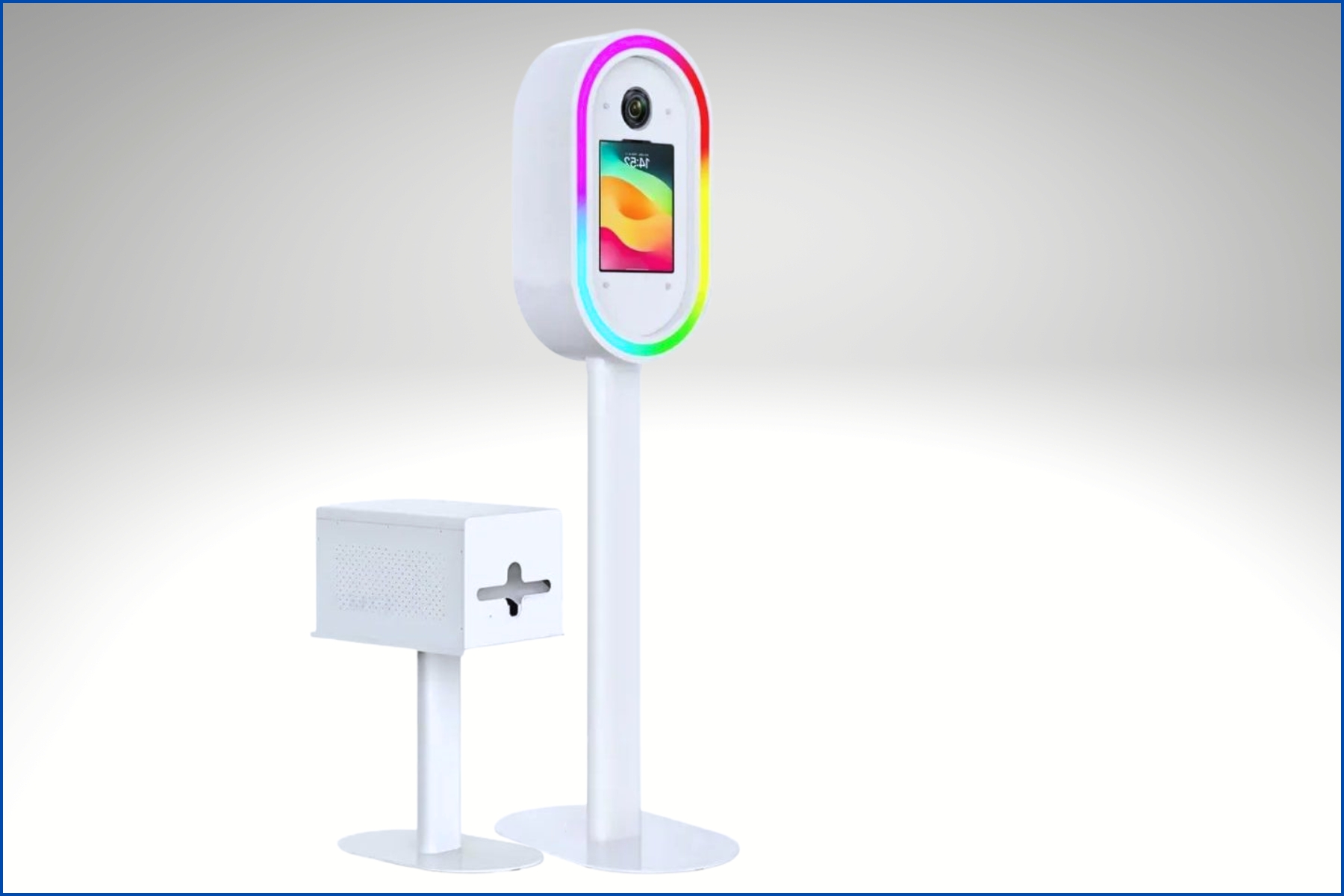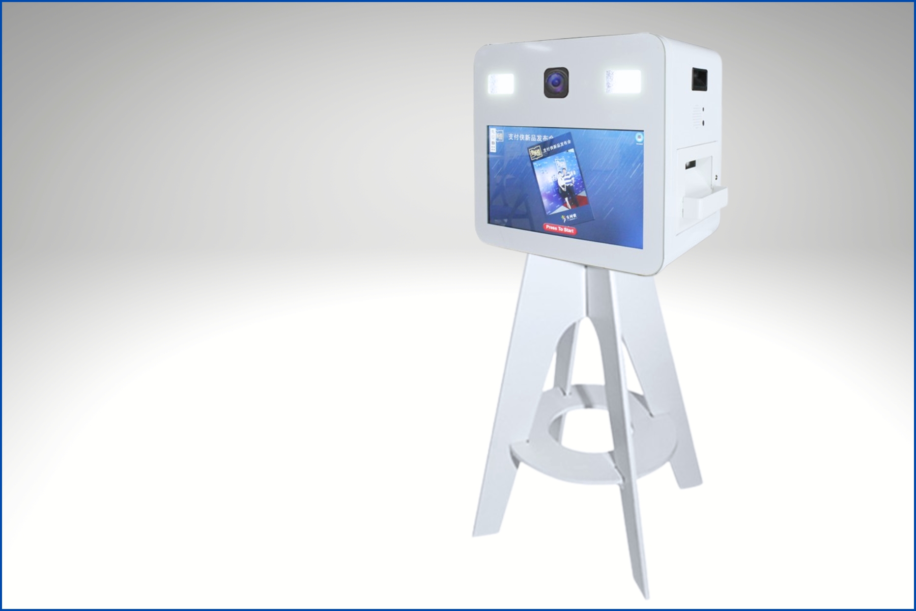 This sleek, all-in-one portable photo booth features a minimalist white design equipped with a high-definition camera, integrated LED studio lights, and a responsive touchscreen interface. Designed for instant engagement, it includes a built-in printer slot for on-site keepsakes and is supported by a stylish, contemporary tripod stand perfect for weddings, parties, or corporate events.