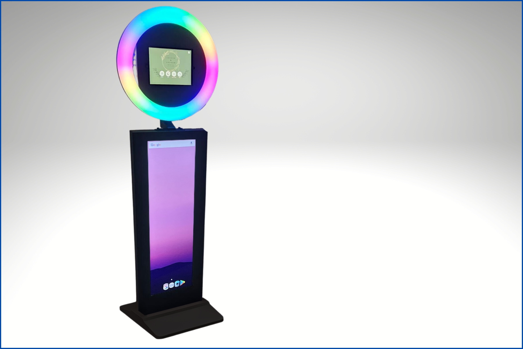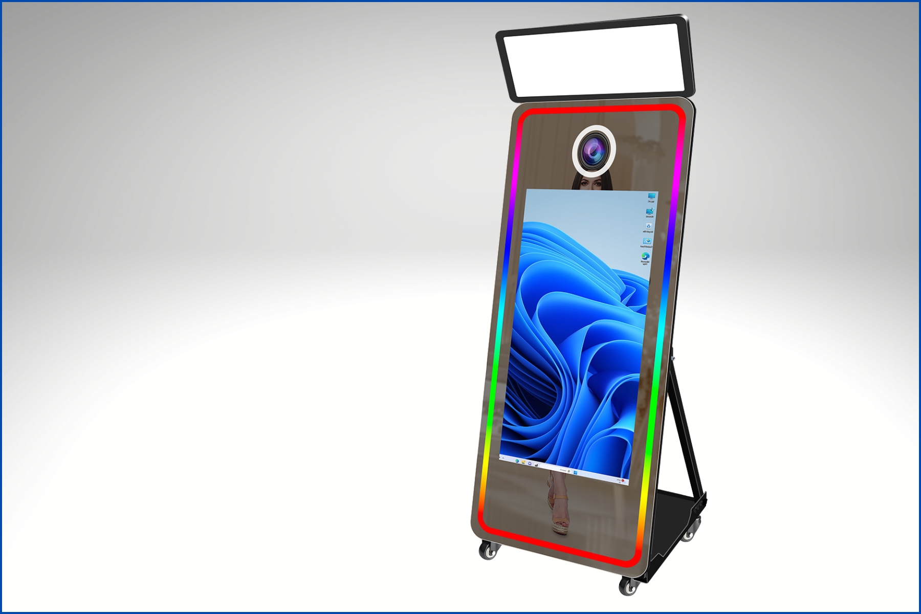 A stylish, full-length mirror photo booth with an interactive touchscreen and vibrant animations, inviting guests to strike a pose and capture fun, high-quality photos—perfect for weddings, parties, and special events.